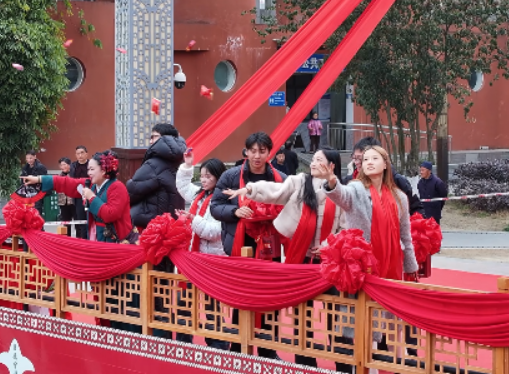 随后,备受期待的媒婆“花姐”闪亮登场。她以幽默风趣的开场白瞬间点燃全场气氛。三位“女儿”在她的带领下依次亮相,现场“招婿”环节更是将活动推向高潮。女儿们或站在台上抛绣球,或走入人群中“选婿”,现场笑声不断、掌声连连。有趣的是,二女儿和三女儿的绣球竟被勇敢的男嘉宾“抢”走,直接表达了对心仪对象的喜爱,展现了当代青年敢于追爱的勇气与真诚。