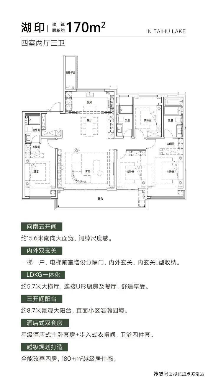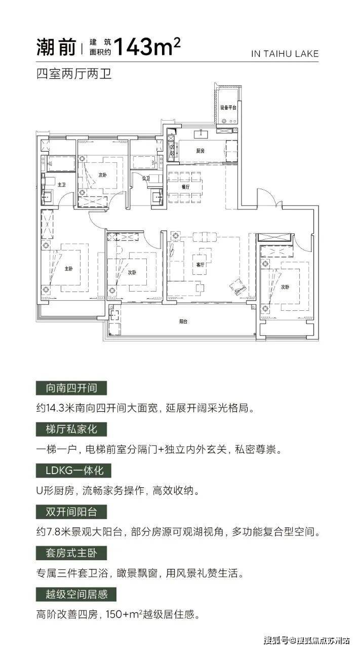 奢适:全宽厅,每个房间都赠送飘窗,景观阳台最小约7.8米,得房率甚至比普通洋房高。