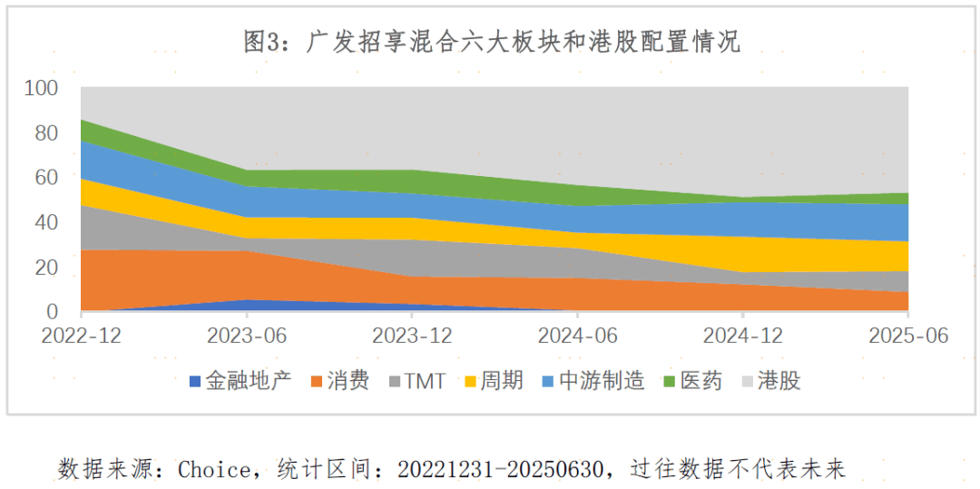 这个均衡分散体现为两方面,一方面是跨市场的分散,另一方面是板块和行业的分散。从图3可以看到,广发招享混合在进入2023年之后开始逐步提升港股持仓股票的占比,到2024年末时港股持仓占股票资产的比例维持在40%-50%区间。而港股从2024年初开始先于A股开始反弹,因此广发招享混合加码港股,较好地捕捉到了港股的机会。