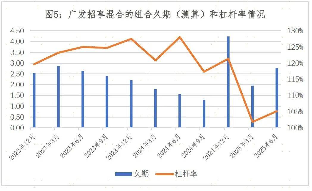 经过几年的牛市行情后,我们发现,债券的持仓有明显变化。最近一年,广发招享混合逐步降低了久期,同时显著降低杠杆率。