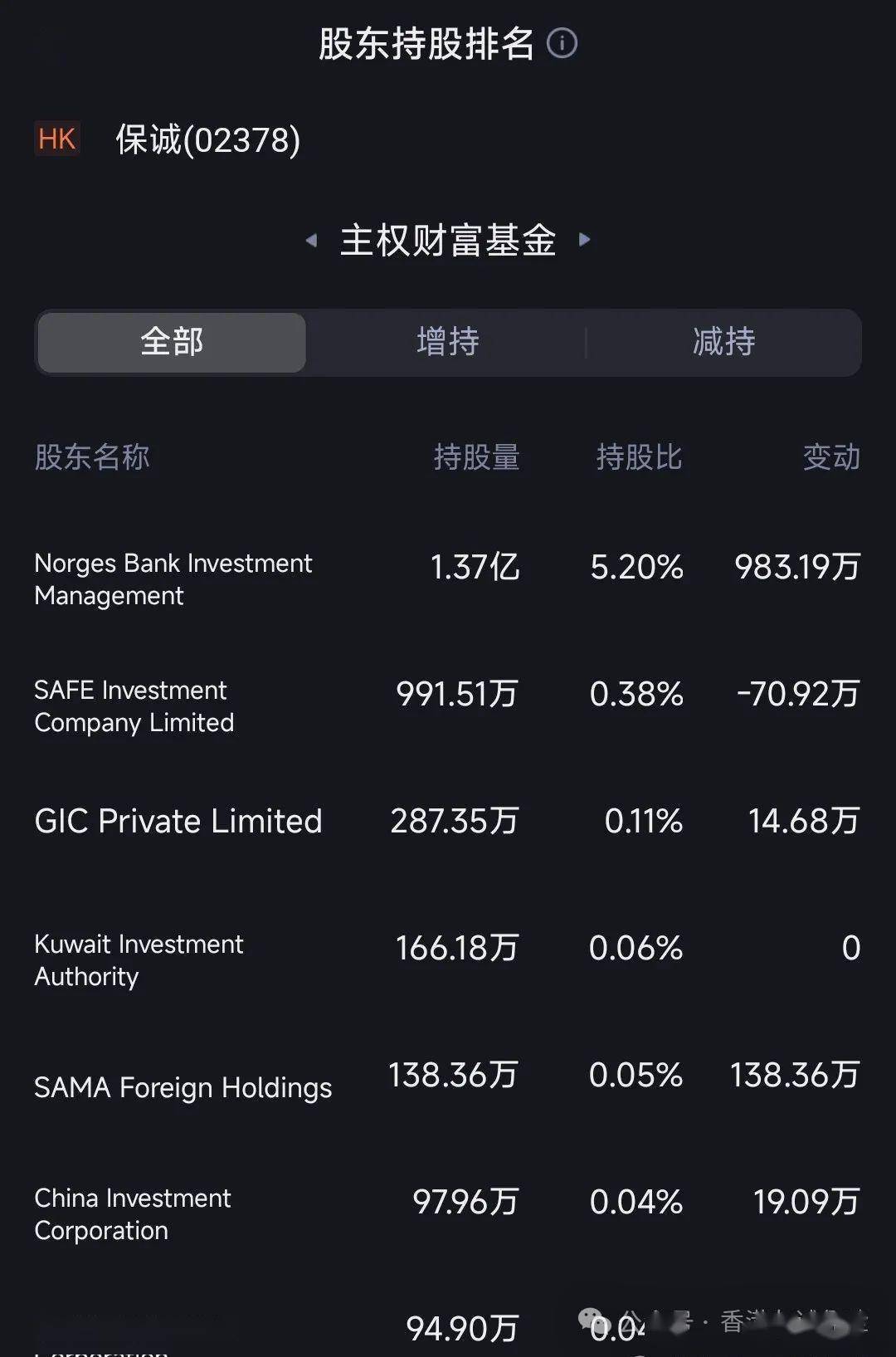 主权基金“巨鲸”集体加仓:看看保诚最新的股东名单(2025年),堪称“国家队”天团: