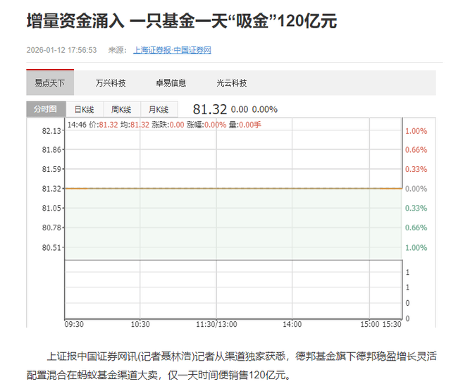 产品收益短期大涨,似乎是最好的广告。据《上海证券报》报道,1月12日,单蚂蚁基金一个渠道,申购这只基金的资金就有120亿元。