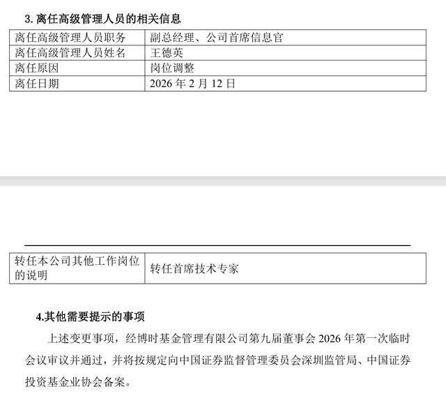 对于王德英离任首席信息官、副总经理,博时基金公告提到的原因是岗位调整。而转任的首席技术专家岗位,在公募行业鲜有出现。