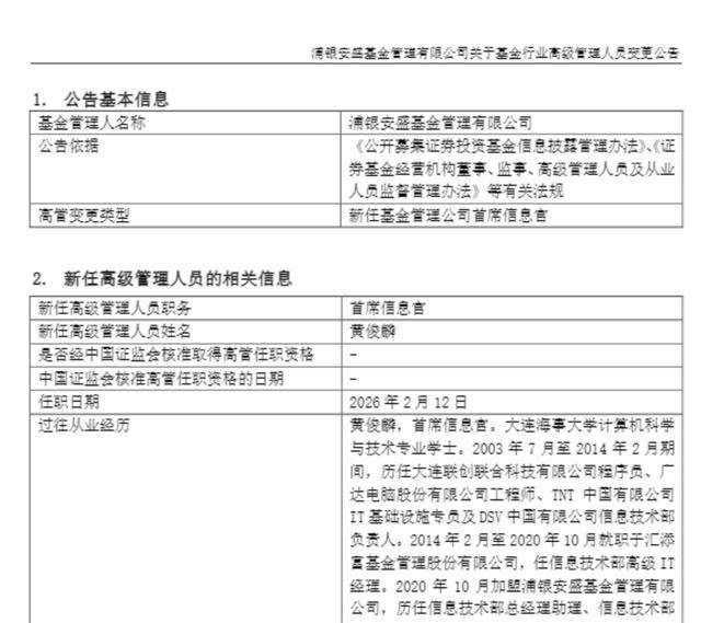 他自2026年2月起,担任公司首席信息官兼信息技术部总经理。此次升任之前,浦银安盛基金首席信息官一职已经空缺超过2年。