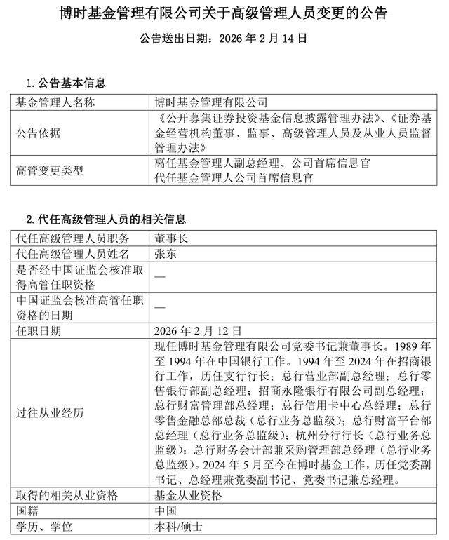 2026-02-14AYX爱游戏,爱游戏体育,爱游戏体育官网,爱游戏APP下载一是博时基金,自2月12日起,王德英离任博时基金副总经理兼首席信息官,转任首席技术专家,董事长张东代任首席信息官一职。