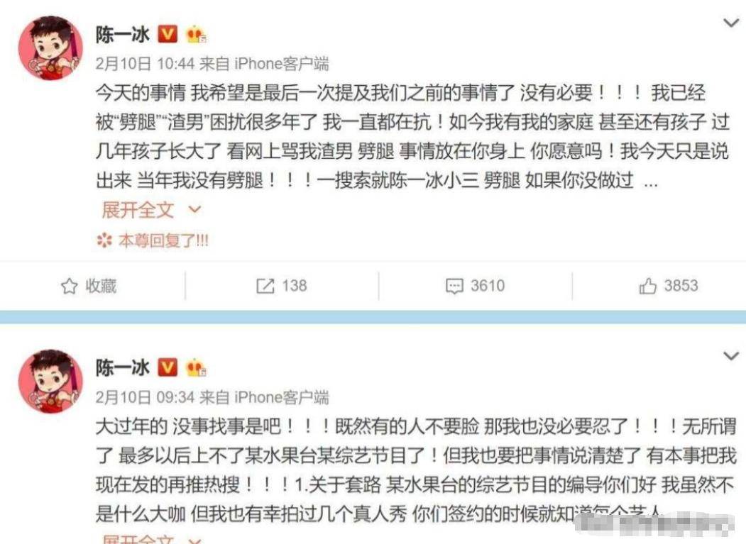 陈一冰暴怒之下发文,怒斥节目恶意剪辑,还曝出更多细节,称当年的第三者只是粉丝,借在家聚会的机会拍照造谣。
