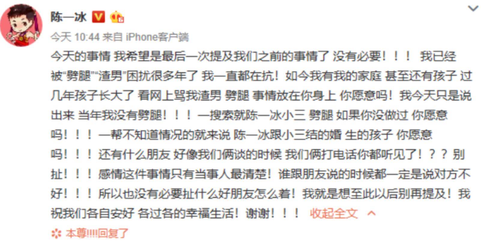 短短几天后,陈一冰突然在微博官宣,称两人早已因性格不合分手,坚决否认有小三。