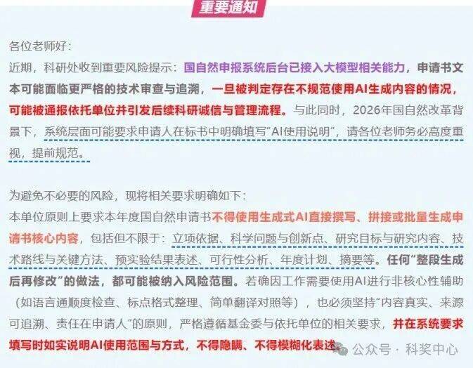 2026-03-18AYX爱游戏,爱游戏体育,爱游戏体育官网,爱游戏APP下载最近网上流传了一张截图,具体内容是某单位发布了新通知,说国自然申报系统后台疑似已接入大模型相关能力一旦被判定存在不规范使用AI生成内容的情况,可能被通报依托单位并引发后续科研