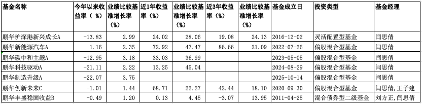 根据Wind数据,截至4月10日,闫思倩掌舵的鹏华碳中和主题A、鹏华沪港深新兴成长A、鹏华科技驱动A、鹏华制造升级A(成立于2025年10月14日)等4只基金今年以来净值跌幅超过10%,分别为-12.95%、-13.83%、-21.11%、-22.07。